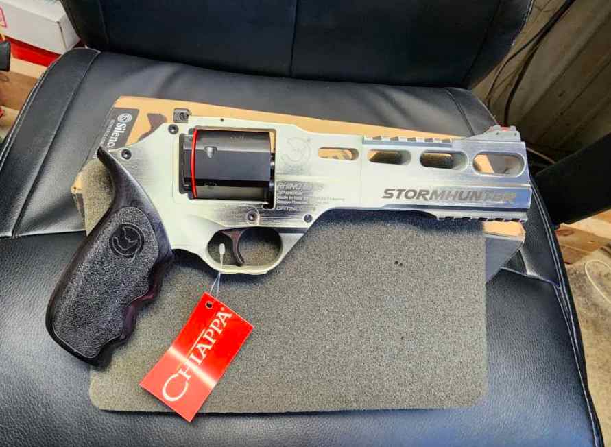 Brand New in Box Limited Edition Chiappa Rhino StormHunter Revolver .357 MAG/38 Special. Chiappa number 340.334. The Rhino is the most innovative development in revolver technology in decades, if not since the creation of the revolver itself. Unconventional in appearance and superior by performance, the Rhino fires from the bottom of the cylinder rather than the top. This dramatically reduces muzzle rise and recoil felt by lowering the axis of the bore almost to the palm of the shooters hand. Rhino Features a 6 Inch barrel, Aluminum frame, 6 Round Capacity, Walnut Grips, single/double action shooting, Red fiber optic front sight, Adjustable Green fiber optic rear sight, Hexagonal cylinder, overall length of 10.50 inches and a weight of 2 Pounds!